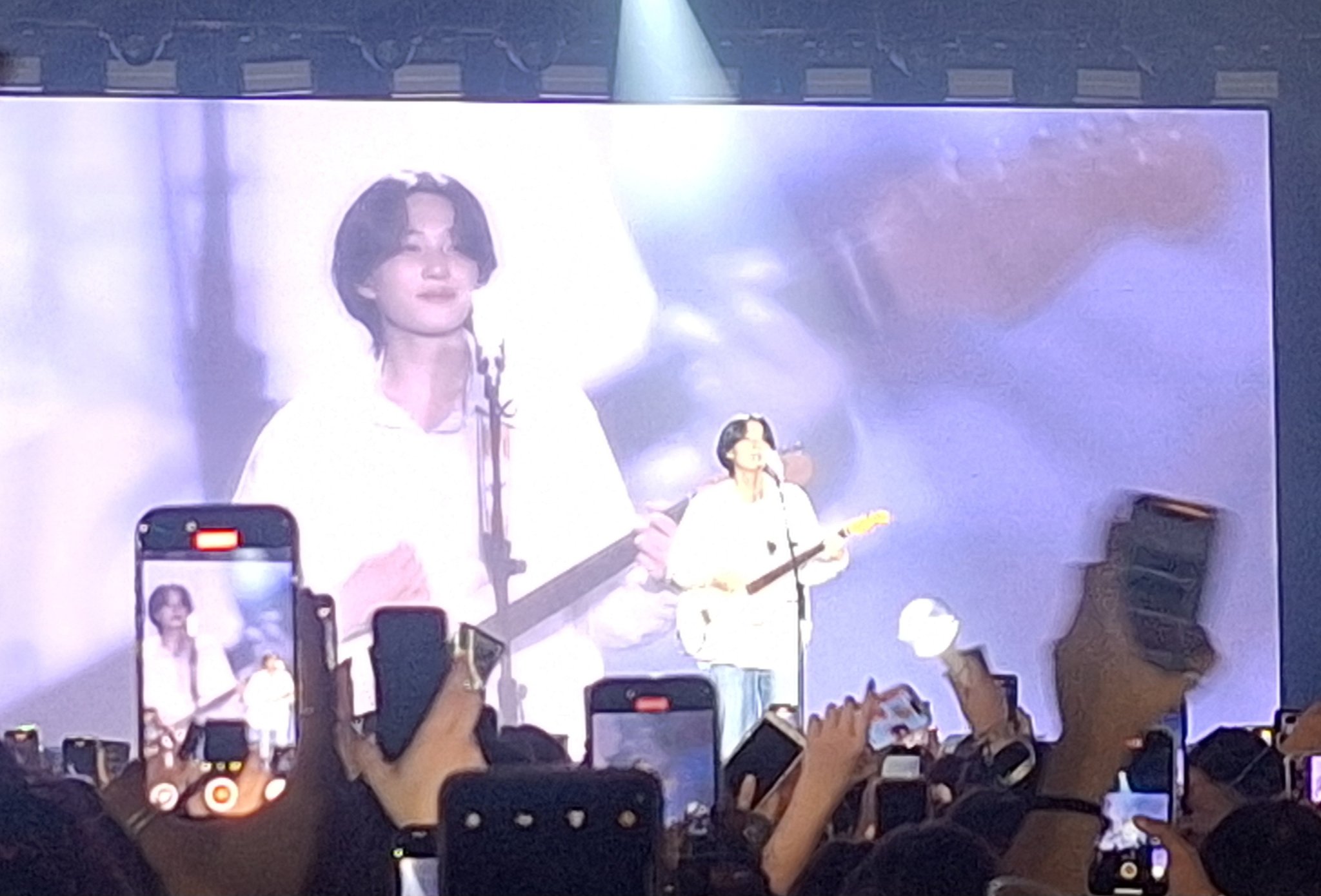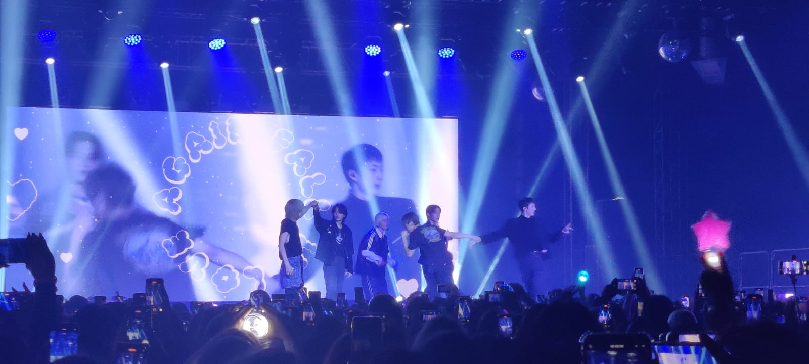 Pero tras el vídeo empezaron los solos, que abrió mi bias, Theo, cantando con la guitarra el mítico Don’t Look Back in Anger de Oasis, con todos entregadísimos, entonando la letra de la canción con él. Y con un pequeño bis, ya que al terminar, volvió a tocar los acordes con la guitarra y esta vez fuimos nosotros quienes le cantamos a él. Le siguió Intak con On My Mama, con una coreo que no podía ser más sexy (oh my god, el momento cinturón) y tan dinámica que ni las cámaras podían seguirle el ritmo. Después de él, Jongseob, el maknae del grupo, nos marcó el ritmo e hizo cantar al público al ritmo de Praise the Lord (ASAP Rocky). Y, a continuación, Soul solo hizo un solo de baile maravilloso, de los que cualquier amante de la danza contemporánea, no solo los fans del kpop, disfrutaría. Tras él, Keeho, cantó WILDFLOWER, de Billie Eilish, a coro con el público y es que esta fue una de esas actuaciones donde la letra de la canción se proyectaba en las pantallas del concierto. Y el apartado de solos lo cerró Jiung al ritmo de Baby, de Justin Bieber, que todos los que estábamos allí gozamos, bailamos y cantamos con él.